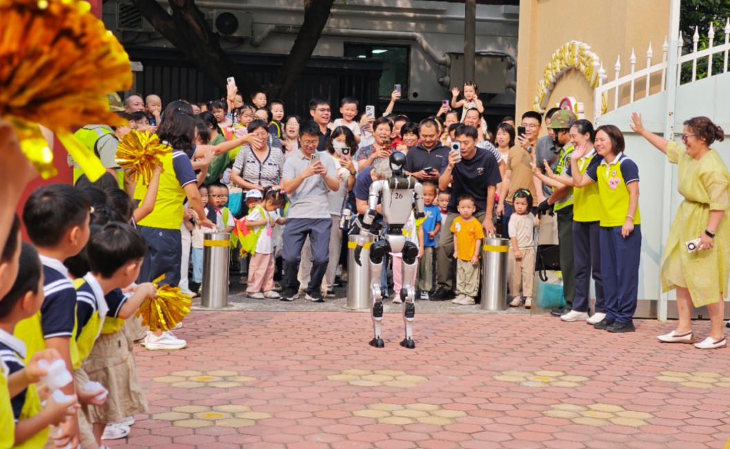 活动现场,机器人在门口挥舞手臂、热情问好,孩子们纷纷围拢互动,为迎新活动增添了科技气息。芽班幼儿在爸爸妈妈的陪伴下,缓缓走过由哥哥姐姐用星星灯搭建的“成长通道”,在温馨的氛围中,带着祝福与期盼踏入幼儿园。苗班幼儿手持爸爸妈妈书写的寄语车票,踏上“成长号列车”,开启新学期旅程。果班幼儿分工协作,将手中的拼图碎片一一拼接,共同汇成象征团结的“成长树”,凝聚班级温暖。在庄严的升旗仪式中,老师与孩子们一同回顾中国人民抗日战争暨世界反法西斯战争胜利80周年纪念活动精彩瞬间,鼓励幼儿以军人叔叔为榜样,学习他们不怕困难、勇于担当的精神。