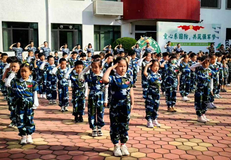 入场仪式上,孩子们身着整齐迷彩服,手举特色班牌,喊出“迷彩小勇士,敢闯敢拼搏”等口号,尽显幼儿蓬勃朝气。升旗仪式上,果一班小小升旗手们昂首挺胸,伴着国歌声,缓缓升起五星红旗,全体师生肃立注目。随后教官带领幼儿体验站军姿、稍息立正、跨立等动作,孩子们认真听指令,挺直小身板模仿动作,专注的模样宛如“小小迷彩兵”。韵律操展示环节,苗班和果班幼儿伴着轻快的音乐,以舒展有力的动作、整齐划一的节奏,展示花棍操和武术操。芽班幼儿热情互动,为哥哥姐姐们加油。